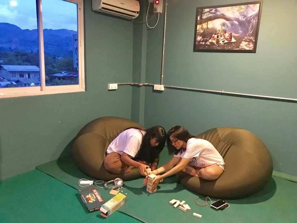 အပေါ်ဆုံးထပ်မှာပဲ Chill Area ဆိုပီး အခန်းလေးလုပ်ထားပေးသေးတယ်။ ကိုယ့်ပါကိုယ် သီးသန့်နေချင်တဲ့သူတွေ၊ အလုပ်လုပ်ချင်တဲ့လူတွေ၊ အေးဆေးနေချင်တဲ့သူတွေအတွက် တော်တော် အဆင်ပြေပါတယ်။ ရေခဲသေတ္တာလဲထားပေးထားတော့ ကိုယ့်ပါကို ဝိုင်ပုလင်းလေးသယ်လာ ထည့်ပီး အေးအေးလေးသောက်။ စာအုပ်လေးဖတ် အို အဆင်ကိုပြေနေရော။ အဲ့လိုမနေချင်ဘူး ဂိမ်းတွေဆော့မလား? ရသေးတယ်နော် 🤗 Uno, အင်္ဂစာလုံးဆက်တဲ့ဂိမ်းတွေရော တခြားဂိမ်းတွေပါထားပေးထားတယ်။ Bean Bag seat လေးတွေလဲရှိတော့ သက်သောင့်သက်သာနဲ့ အေးဆေးchill 😊