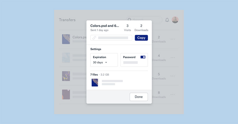 သုံးစွဲသူက Transfer ထဲကဖိုင်ကို drag နဲ့ drop လုပ်ပြီး အခြားသူတစ်ယောက်ဆီ လင့်ခ် ဒါမှမဟုတ် အီးမေးလ်ကို ပေးပို့နိုင်ပါတယ်။ ဖိုင်ဝေမျှမှုမှာ ဖိုင်ကို အသုံးပြုဖို့ အသေးစိတ် ထိန်းချုပ်မှုပါဝင်ပြီး ဖိုင်အတွက် password ဒါမှမဟုတ် ရက်ကုန်ဆုံးမယ့်ရက်ကို သတ်မှတ်ထားနိုင်ပါတယ်။ ဖိုင်လက်ခံရယူမယ့်သူက Dropbox သုံးစွဲသူ ဖြစ်စရာမလိုပါဘူး။