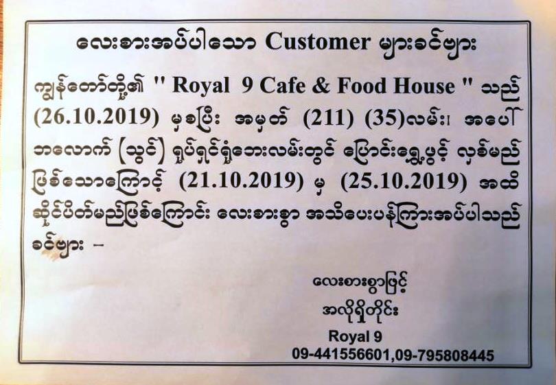 အစားဘုရင်တွေလည်းဟုတ်တယ် ဆိုင်သန့်သန့်လေး‌မှာလည်း စားချင်ပါတယ်ဆိုသူများ ဒီတစ်ပတ်တော့ ကျောက်တံတားမြို့နယ်ထဲမှာရှိတဲ့ Royal 9 ဆိုတဲ့ ဆိုင်လေးနဲ့ မိတ်ဆက်လိုက်ပါတယ်ဗျ