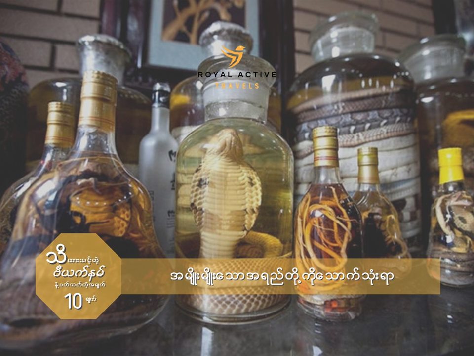 ဗီယက်နမ်တွေက အစားသာလျှင်မကဘဲ အသောက်မှာဘာအမျိုးစုံတယ်လို့ ပြောလို့ရအောင် ၊ ကော်ဖီဆိုင်လို နေရာမျိုးမှာတောင် အမျိုးစုံသောက် တတ်ကြသူတွေပါ ။ သူတို့ဘာတွေသောက်သလဲဆိုရင် လမ်းဘေး ကော်ဖီဆိုင်တွေမှာ ကြက်ဥကော်ဖီ ၊ ဒိန်ချဉ်ကော်ဖီ ၊ အုန်းနို့ကော်ဖီ ၊ ဖျံချေးကော်ဖီတွေ အပြင် ထူးထူးဆန်းဆန်း စပါးကြီးမြွေစိမ်ထားတဲ့ မြွေအရက် ၊ ကင်းမြှီးကောက်စိမ်ထားတဲ့ ကင်းမြှီးကောက် အရက် တို့လိုမျိုးတွေကိုလည်းတွေ့ရမှာပါ။ မြွေစိမ်ထားတဲ့ အရက်ကိုသောက်သုံးသူတွေက အသက်ရှည်ပြီး ၊ ကျန်းမာ တယ် လို့ယူဆတယ်လို့ လည်းသိရပါတယ်။ သင်ရောအခုပြောခဲ့တဲ့အရည်တွေထဲက ဘယ်အရည်ကိုစမ်း သောက်ကြည့်ချင်လဲ ၊ ပြောကြည့်။